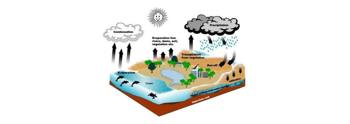 Warmth from the sun causes water from lakes, rivers streams, ice, and soils to turn into water vapour in the air. Almost all of the precipitated water (80 percent) goes right back into the air because of evaporation. The rest runs off the land or soaks into the ground to become ground water.