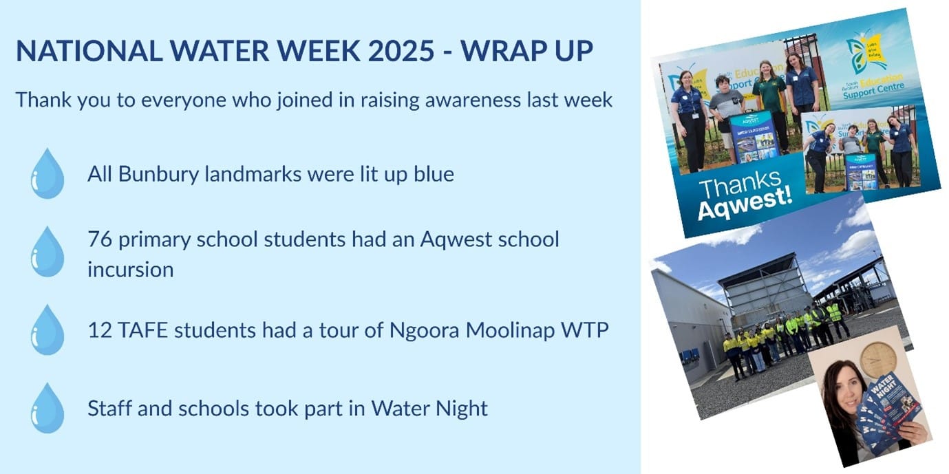 National Water Week is hosted by the Australian Water Association and promoted locally by Aqwest, by encouraging individuals, communities, schools and organisations to be inspired to promote the importance of water in October.